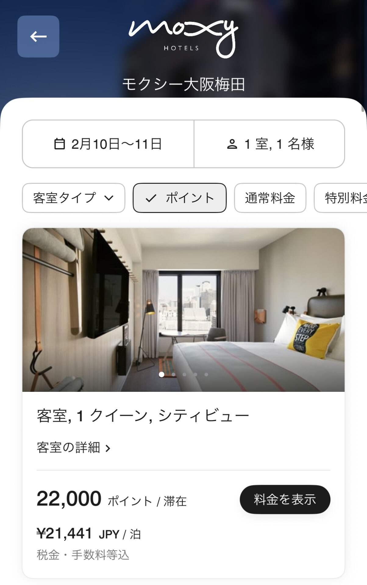 ちなみに僕たちは、マリオットポイント14,000Pt / 泊で宿泊しました(少なめ!!)。
