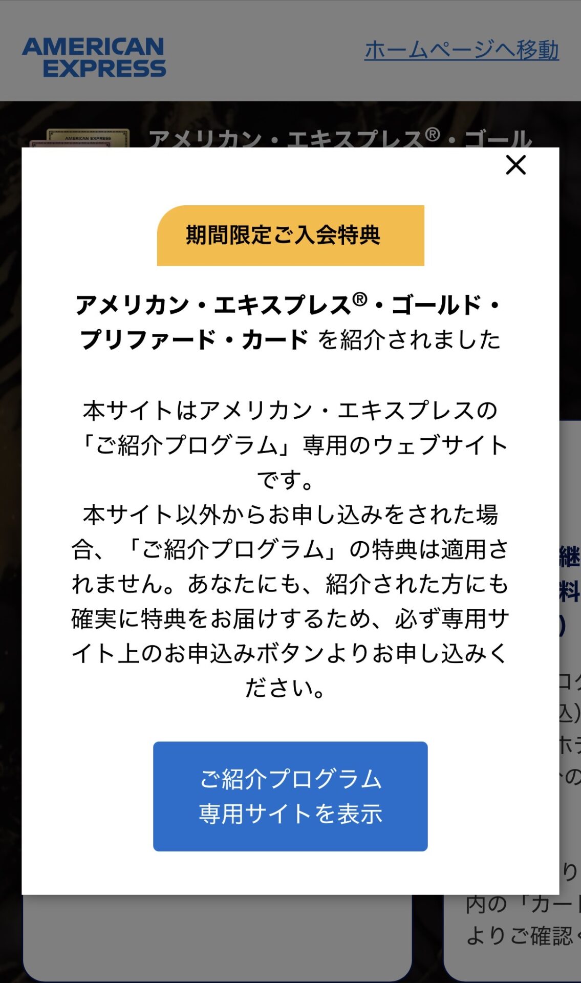 ポップアップされる「ご紹介プログラムへようこそ」のうち、「ご紹介プログラム専用サイトを表示」ボタンを押します。