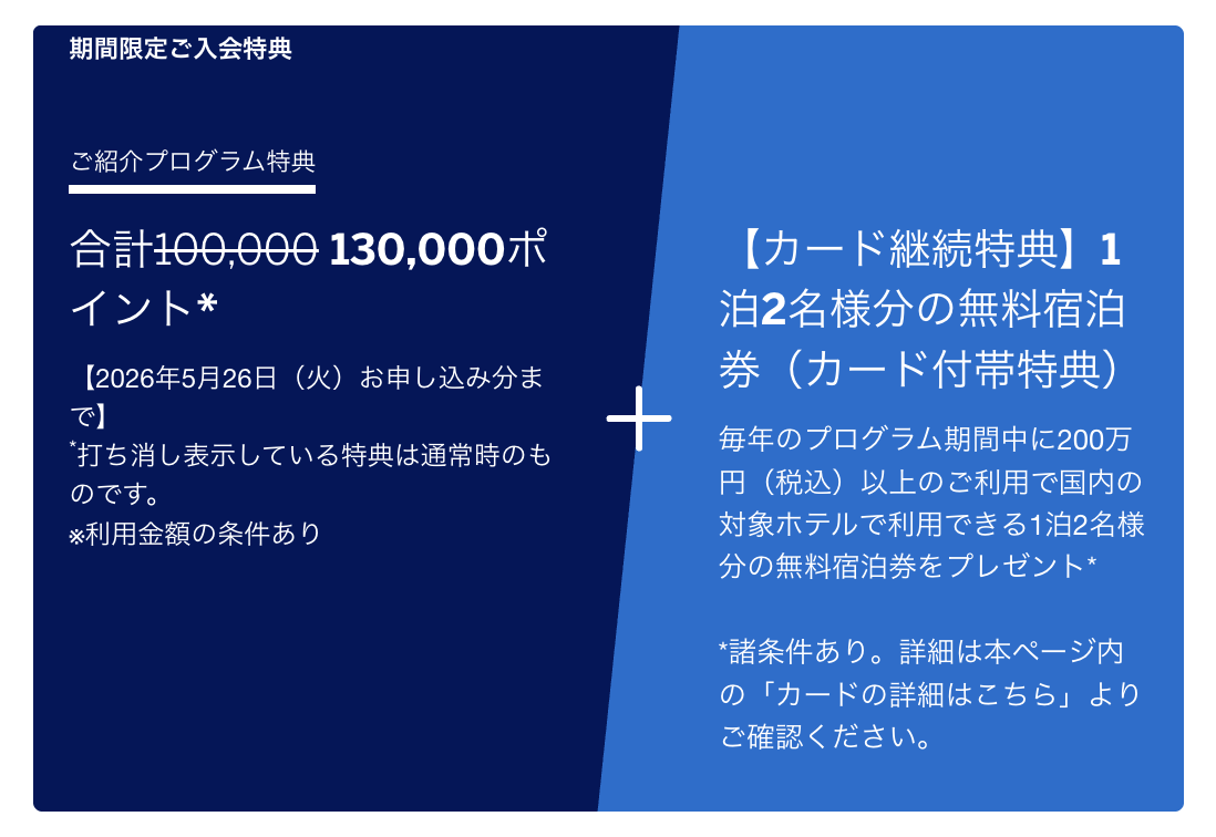 - 最大獲得ポイント:130,000ポイント(紹介経由)/ 110,000ポイント(公式)