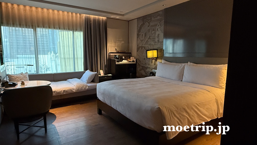 客室数は441室で、2018年のリニューアルを経て、グレーと淡いトーンの洗練されたインテリアに生まれ変わりました。