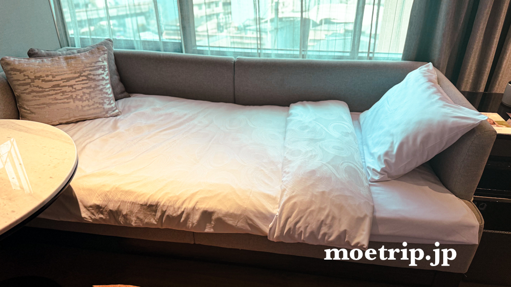 ベビーベッドの依頼をし忘れていたのですが、ソファでも寝られるようにベッドメイキングしていただいていました。