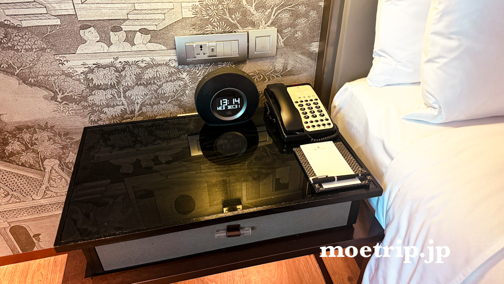 ベットサイドにも電話、目覚まし時計とメモ帳。