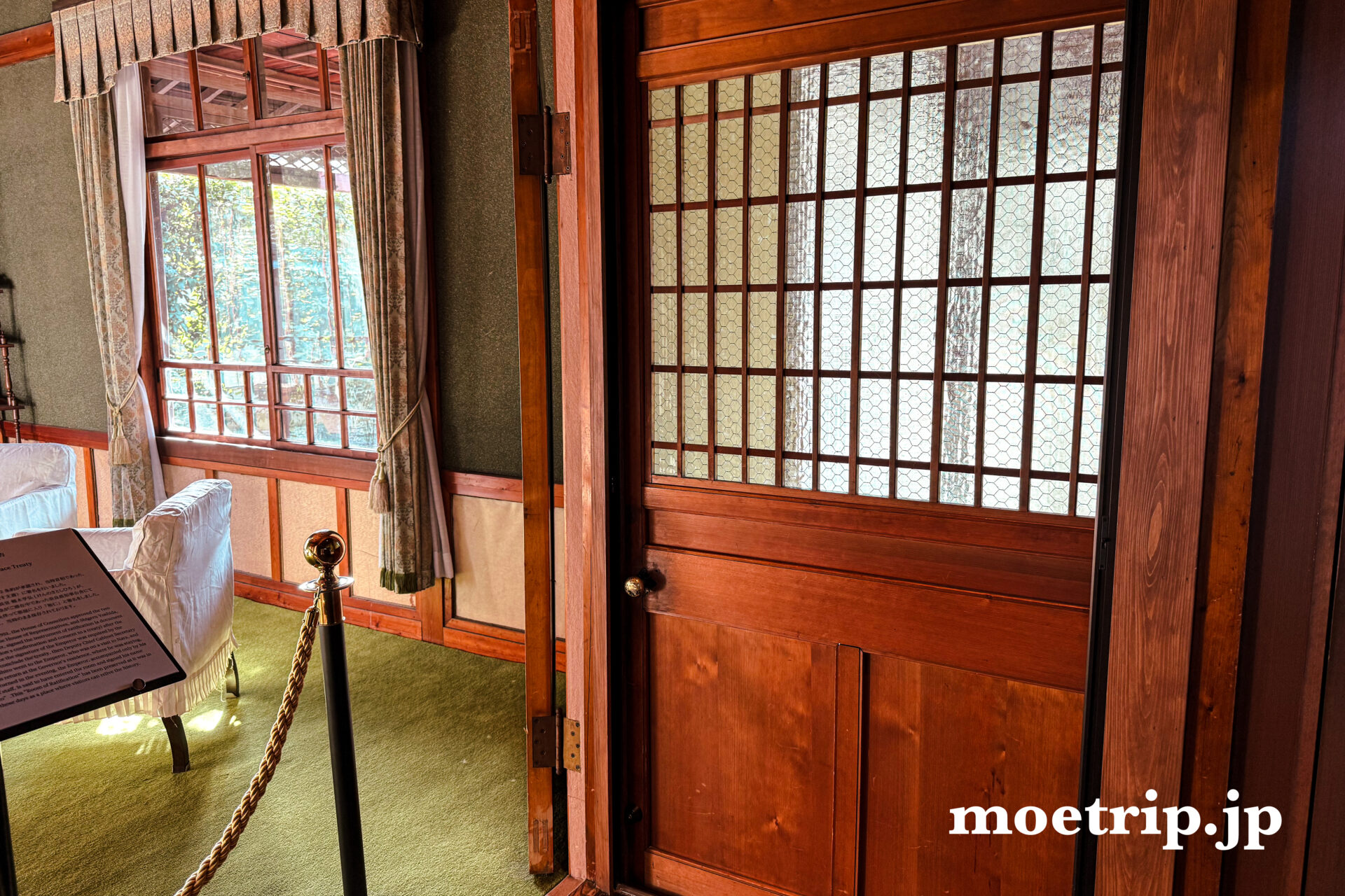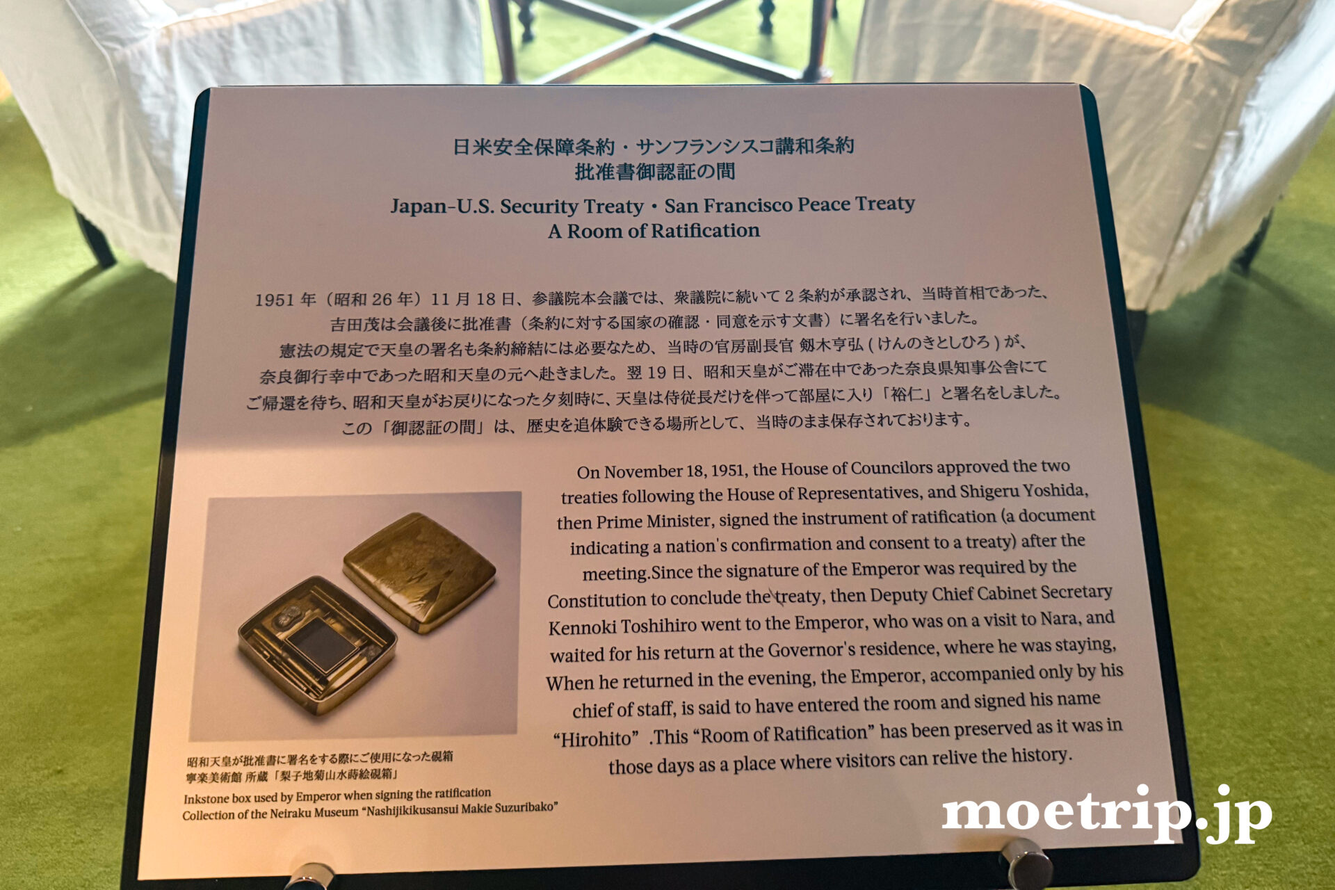 レセプションのすぐ横の部屋には、日米安全保障条約 サンフランシスコ講和条約 批准書御認証の間があり、カーペット以外のイスや窓などは、1951年当時のものがそのまま置かれていました。